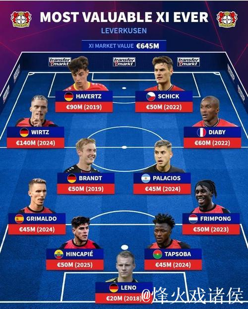 勒沃库森在贝尔沙巴的奇迹赛季之后,话题不仅停留在不败夺冠和“黑金工厂”的故事上,转会市场上这家德甲俱乐部的身价井喷同样引人关注。近日,有德国媒体按照球员历史最高身价(转会费或估值峰值)组合出了一套“勒